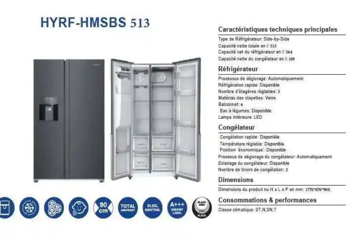 Refrigerateur HYUNDAI side by side 513L Inox Nouveau